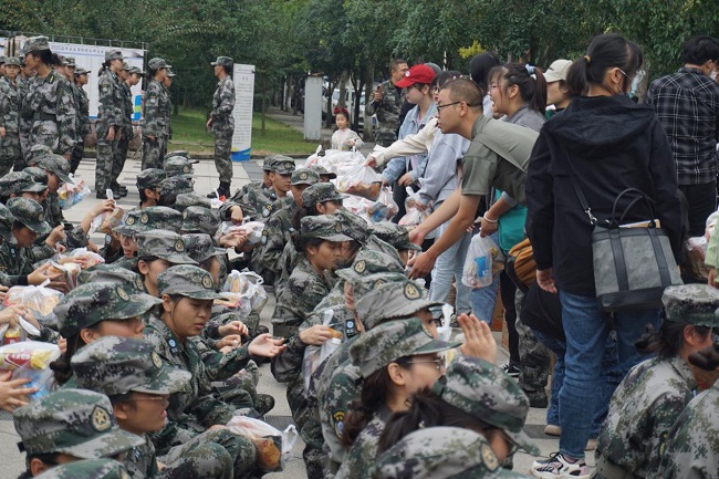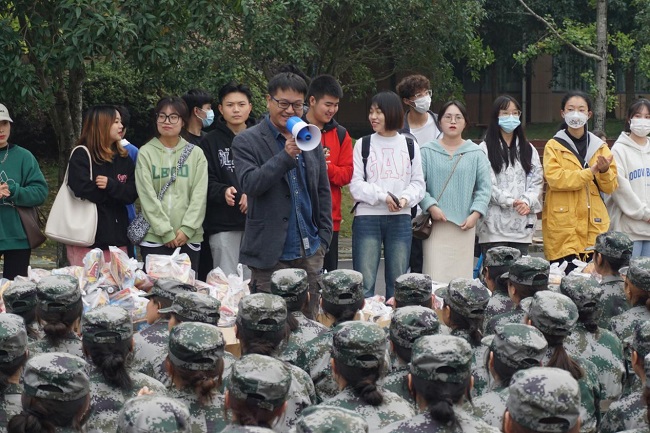 冉勇代表学院向全体军训教官表示诚挚的感谢,表扬了参训学生在训练场上展现出的昂扬斗志,勉励同学们要珍惜集体生活,在军训中培养吃苦耐劳的精神,增强组织纪律观念。郑曾俊希望新生要懂得感恩师兄师姐和教官,在军训中磨炼意志,顺利完成军训的各项任务。接下来,学院领导、老师们与参训学生、教官亲切交谈并发放慰问品。