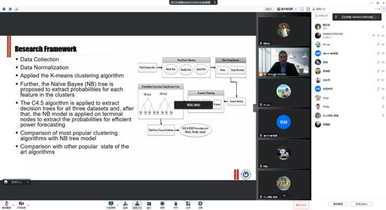 曼苏尔汗的第二个讲座名称是基于聚类的概率决策树大规模风电功率预测。他提出了一种新的基于聚类的概率决策树混合方法来有效预测风电功率。对收集的数据进行噪声信息筛选,并选择主要有助于准确预测的变量。然后,使用均值和标准差对风数据进行归一化,以提取每个特征的播放级别字段。基于数据行为的相似性,采用K-means聚类算法将样本分为包含历史风数据的不同组。此外,提出了朴素贝叶斯(NB)树来提取集群中每个特征的概率。NB树是C4.5和NB方法的混合模型,成功应用于从国家可再生能源实验室(NREL)收集的三个大型真实世界风数据集(含每小时、每月、每年的数据)。预测准确性表明,所提出的方法可以从数小时到数年的数据中预测准确的风能。将所提出的方法与最流行的最先进技术进行了综合比较,表明该方法提供了更准确的预测结果。