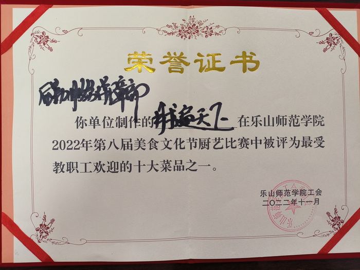 饮食中心制作的铁锅牛三鲜、肘遍天下、良宵游 、香酥米粉肉、风味凤爪五个菜品荣获“最受教职工欢迎的十大菜品之一”荣誉称号。