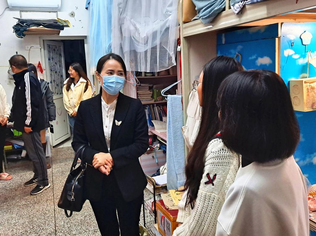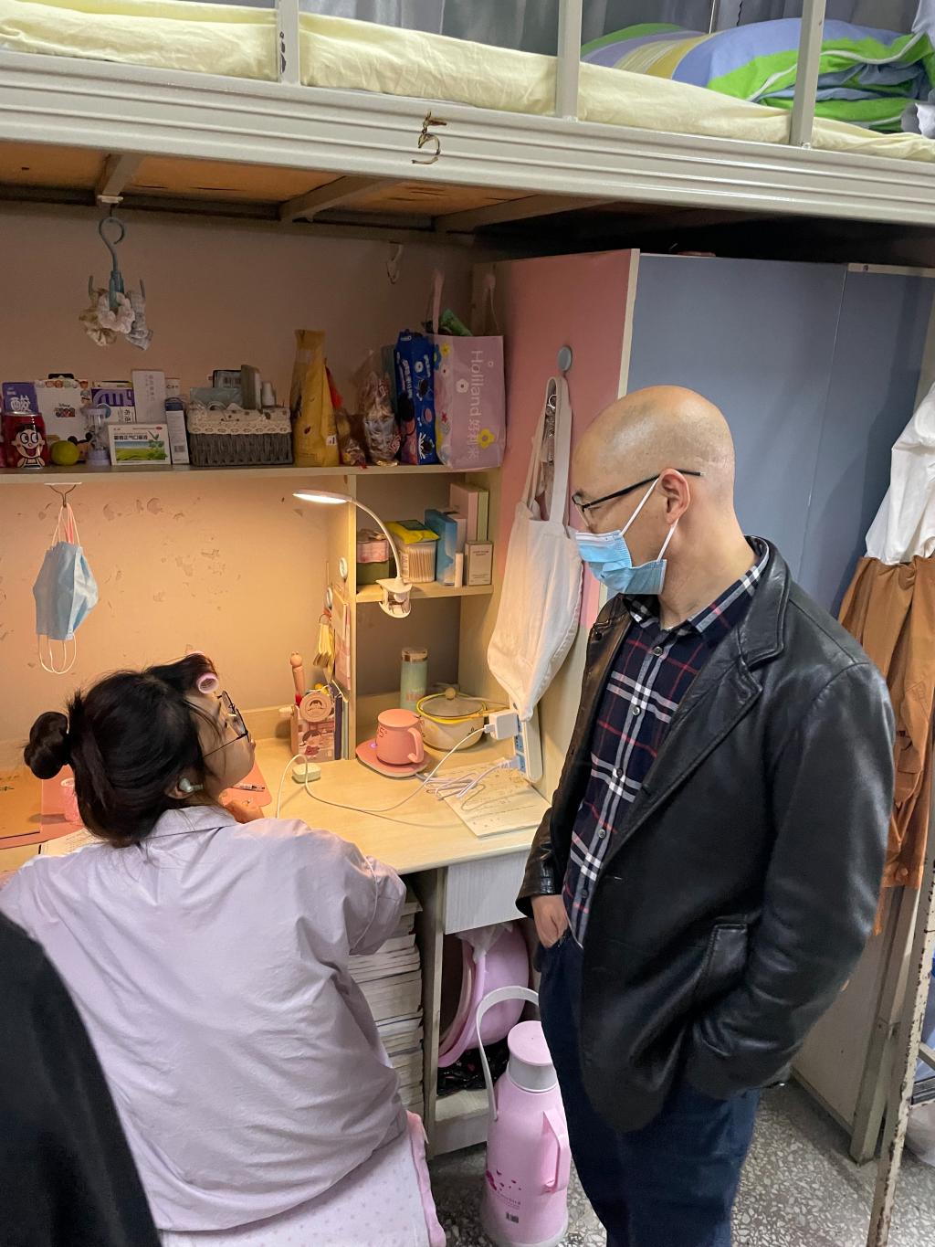 11月4号晚,由学院党委副书记左莉带队,带领辅导员陈盈舟、曹琳、廖宇、郑新美走访学生寝室,深入了解学生的学习和生活情况。走访中,老师们与同学们亲切交谈,详细了解大家的日常生活与线上学习情况,并嘱咐同学们要注意疫情防护与个人卫生,增强安全防范意识,遵守疫情防控期间学校的闭环管理规定,同时要谨防电信诈骗,确保人身安全和财产安全。走访寝室过程中,老师们叮嘱学生要树立大局意识和全局观念,调整好心态,合理安排好闭环管理期间的生活与学习计划,注意劳逸结合,加强体育锻炼,提升体能素质。希望同学们在寝室生活中,互相帮助、互相理解、互相包容,共同营造团结、向上、向好的宿舍氛围。