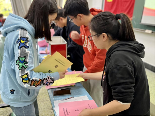 郭晓黎公布了本届两委候选人名单,以及在场的监票人和四位计票人,分别是学院党政办主任李可、学生党员姚雨婷、胡雪琦、朱治军、熊力,现场表决通过。在清点到会正式党员人数表决有效的情况下,由计票员分发选票,党员师生认真填写选票,并进行庄严的投票。