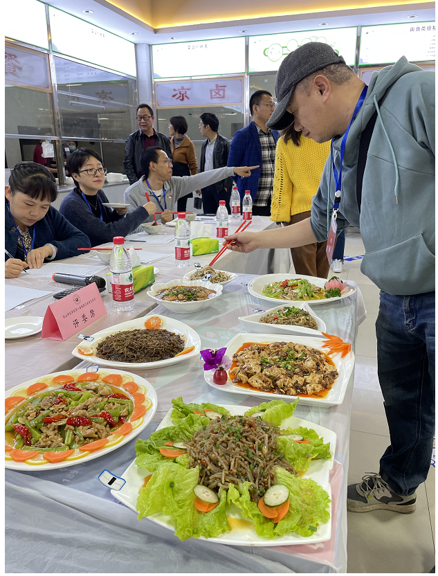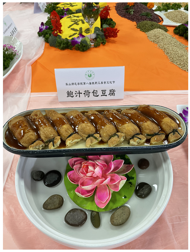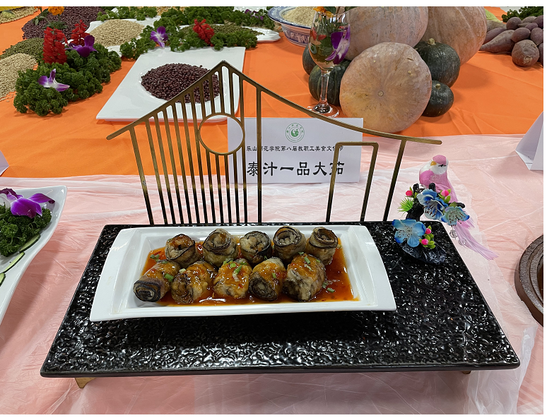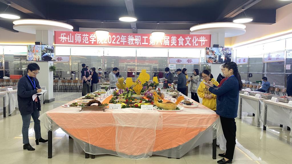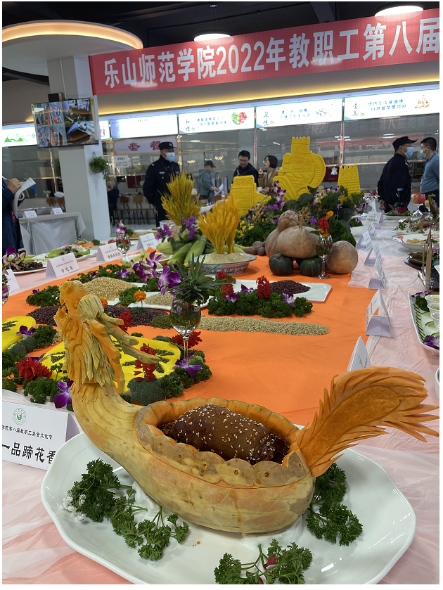 在后勤保障部、师科(陶然居)公司厨师岗位技能展示中,参加展示的各食堂纷纷拿出看家绝活,完成了铁锅牛三鲜、龙腾一品蹄花香气、飘香四季霸王骨等20道菜品。参展菜品形态各异,无论在造型雕刻,还是烹饪技巧等方面均有创新。各种美味佳肴琳琅满目,彰显了厨师们高超的刀工技艺以及食物与艺术的完美结合。一道道色香味俱全的菜肴,让教职工享受了一场“舌尖上的盛宴”。最后经评委评比打分,评出了飘香四季霸王骨、五彩缤纷牛肉卷、泰汁一品大茄等10个菜品为乐山师范学院2022年教职最喜爱菜品。