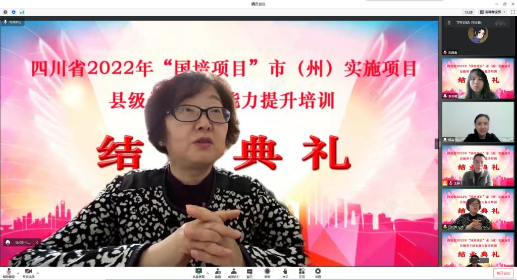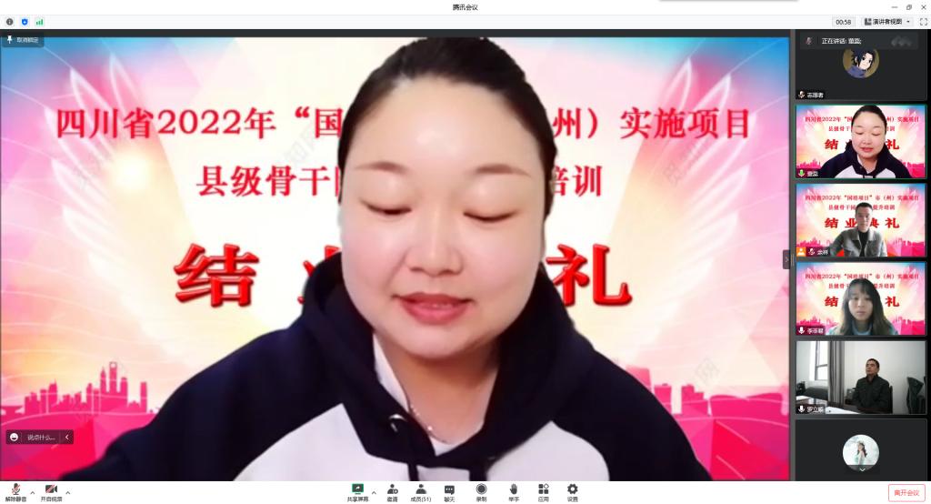 随后,余祥对此次培训作出了总结,代表项目执行团队对培训过程中参训园长的积极配合与支持表示了感谢,肯定了大家的进步与收获。最后汪红烨代表乐山师范学院再次对各位学员圆满完成此次培训表示祝贺,对学员们能在疫情期间完成此次培训给与了极大肯定,并祝愿各位学员在今后幼儿教育工作中取得更大成就。