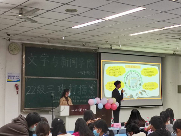 本网讯(文/宋博雯 图/邓福川、黄陆明)为培养学生们的团队精神,增强集体荣誉感和班级凝聚力,文新学院于11月11日晚7点,在行知楼114教室举办了22级“三班打擂”比赛。出席本次比赛的评委有文新学院党委副书记、纪委书记胡平建,文新学院22级辅导员钟蕾,21级辅导员何晓凤,2022级新闻班班主任潘雪,此外还有文新学院分团委副书记和主席团各成员作为嘉宾出席本次活动。