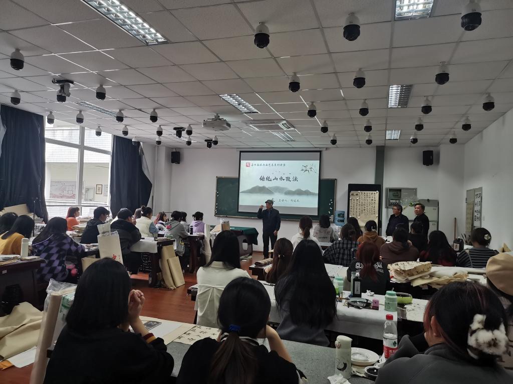 本网讯(文/王孝琴 图/熊火花、门涛)11月10日—11日,美术与设计学院、音乐学院共同开展学科递进项目中的嘉州画派研究活动,邀请嘉州画派传承人盛志中、何兆明、卜敬恒、任承家、何廷光、何可、袁林,国家一级美术师张英豪等八位书画家来校做系列讲座,并开展教研活动。乐山市美术家协会主席、嘉州画院副院长、美术与设计学院教授李开能,美术与设计学院院长熊泽文,音乐学院副院长吴洋,美术与设计学院副院长熊火花、门涛,国画教研室全体教师、音乐学院相关教师和美术学、书法学专业部分学生参加了相关讲座和教研活动。