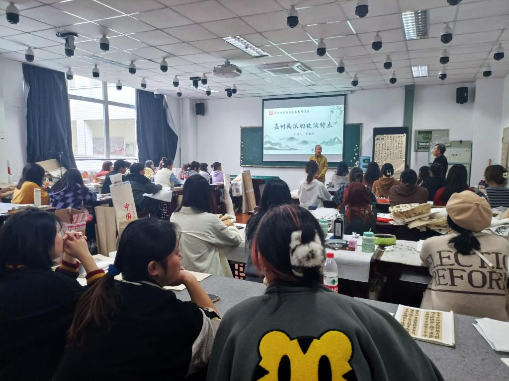 此次系列讲座和教研活动旨在促进学院学科、专业建设,加强对嘉州画派的研究。盛志中、何兆明、卜敬恒等八位书画家分别从《嘉州画派的艺术特质》《嘉州画派的技法特点》《嘉州画派的色彩艺术特点》《嘉州画派的书法艺术特点》《传统人物技法》《传统山水技法》《传统花鸟技法》《传统国画写意》等八个方面作了专题讲座,通过系列讲解让师生们对嘉州画派的艺术特点和基本技法有了较为全面的认识和了解。