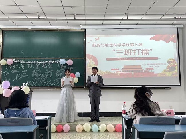 本网迅(文/江馨雨 图/郑淑瑜)为培养新生良好学风,提高学生综合素质,11月12日下午,旅游与地理科学学院在行知楼314教室举办了第七届“三班打擂”活动。大赛由传媒中心主任沙马依古木,分团委副书记陈琳等学生干部代表担任评委,22级学生参加了比赛。