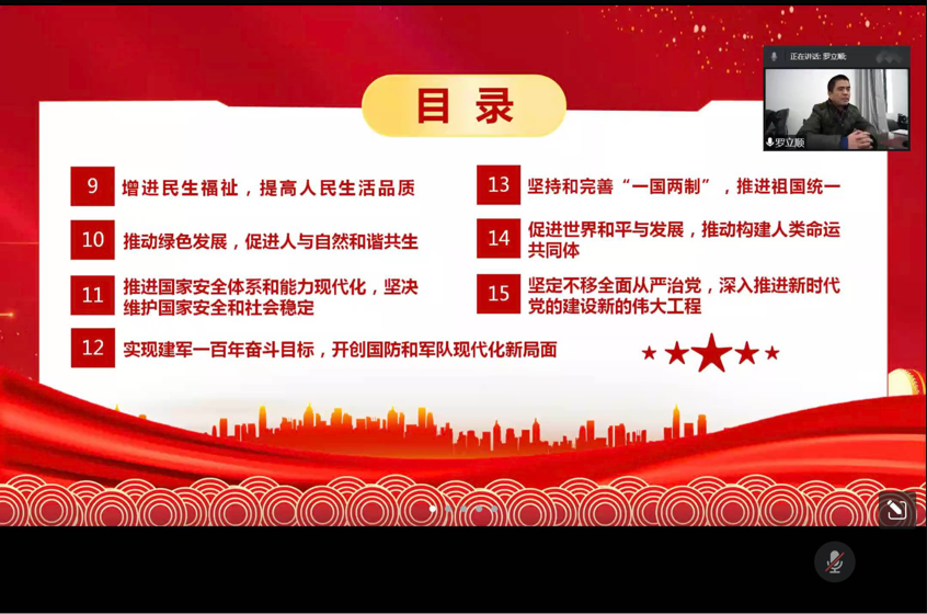 随后,罗立顺进行了线上的第一场讲座《党的二十大报告解读》,就党的二十大的15个主题进行讲解,重点强调了教育最新精神。