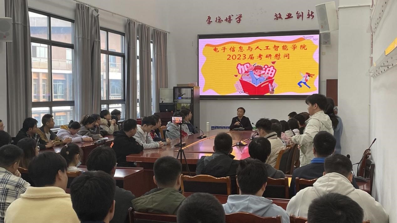 本网讯(文/高明睿 图/左子滔)为进一步表示对考研学子的关心与重视,11月17日下午,电子信息与人工智能学院在特教C501对考研学子进行慰问,出席本次活动的有电子信息与人工智能学院党委书记蒋强,党委副书记方忠,19级辅导员谭红梅,21级辅导员强光平以及所有考研学子。
