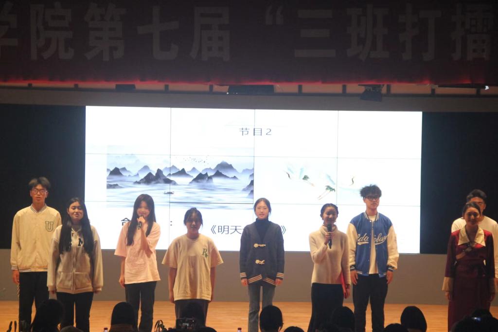 多元发展,包容平等是“三班打擂”传递的理念。旅游管理二班的同学们,以“放眼全球,搏击海浪,旭日东升,顶天立地”为班训,用藏彝汉三族舞蹈串烧向大家展示出多民族多地域各具特色而又相辅相成的班级特色、昂扬前进的班级面貌与多样、平等且包容的班级文化。外国语学院英本四班以“一起向未来”为主题,在音乐与舞蹈中展现了班级因语言而多姿多彩的文化,青春昂扬、积极乐观的精神面貌,与班级团结一致一起向未来的理想信念。
