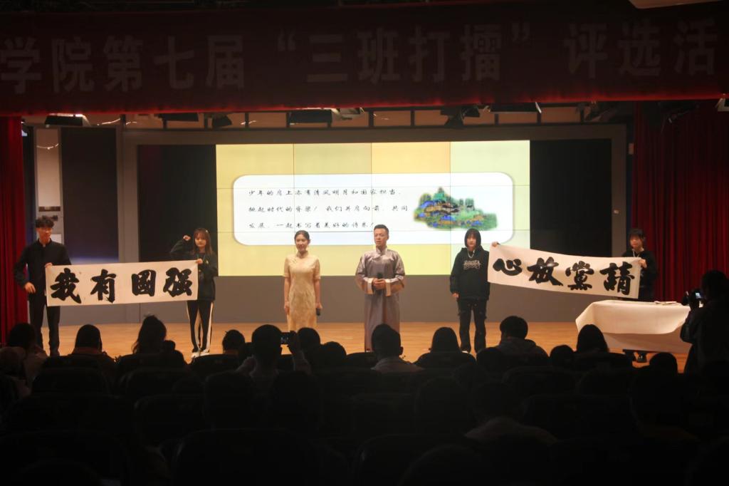 本网讯(文/杨蓓蓓 龚再彬 图/三江潮)11月20日下午,由党委学生工作部、校团委主办,校学生会学科部承办的“三班打擂”活动决赛在旷怡楼一教八阶顺利举行。此次大赛邀请了各学院辅导员作为嘉宾出席,由校学生会主席陈芋伶以及各学院学生分会主席应邀担任大赛评委。参赛班级是由各教学院经过初赛评选推优产生。