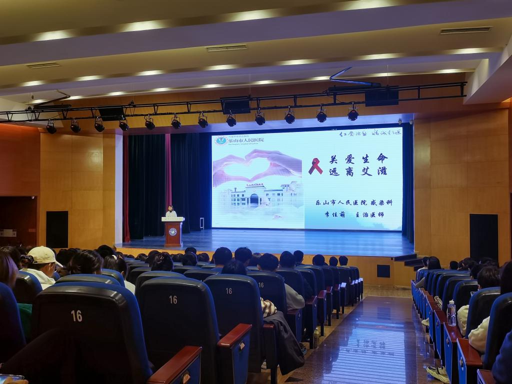 本网迅(文、曾涵/图、黄励)11月19日晚,数理学院在实训楼多功能厅分别开展了2022级新生艾滋病预防和心理健康教育讲座。本次讲座邀请到了乐山市人民医院感染科主治医师李佳萌主讲艾滋病防治教育,学校心理健康教育中心兼职教师张嘉江主讲大学生心理健康教育。学院党委副书记左莉、学生科长兼新生辅导员陈盈舟,465名新生参加本次教育活动。讲座由陈盈舟主持。