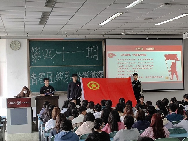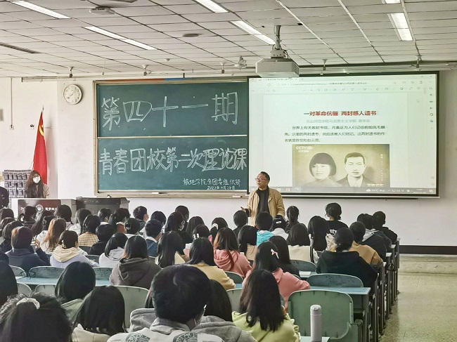 本网讯(文/王潇 图/岳津宇 聂新茹)为提高团员青年思想理论水平,坚定跟党走中国特色社会主义道路的信念,旅游与地理科学学院于11月24日在行知楼325教室举行了以“党旗国旗心中飘,人民领袖立功劳”为主题的第四十一期青春团校第二次理论课。本次理论课特邀马克思主义学院蒋华志教授授课,全体学员及各班团员代表聆听了此次理论课。