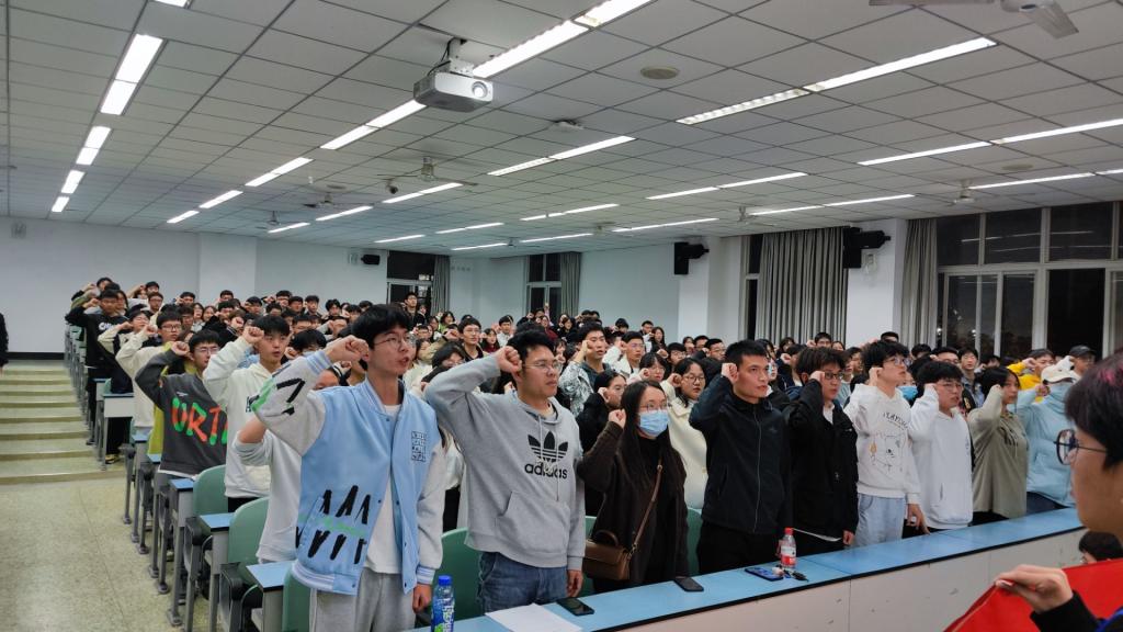 会议开始前,现场播放志愿活动相关视频,青志中心干事引导参会人员入场就位。人员就位后,音频停,陈春宏和胡炜凡宣布青年志愿者注册大会正式开始,然后依次介绍到场领导老师以及嘉宾。随后进入大会第一项,全体起立,奏唱《中国青年志愿者之歌》。会议第二项,李梁发言致词,他表示青年志愿者有着光辉的历史和光荣的传统,希望同学们能够接过青年志愿者的大旗,尽自己的绵薄之力回馈他人,回馈社会。李梁的发言激昂,振奋人心,让现场同学们的心也跟着激烈燃烧起来。会议第三项,21级优秀志愿者王可为同学们介绍自己的志愿者经历,以及参与大大小小志愿活动后的心得体会,给同学们讲授了宝贵的经验。会议第四项,有奖问答互动环节,现场气氛活跃,同学们都认真参与其中。会议第五项,全体起立宣誓。会议第六项,22级新生代表王宇发言,讲述自己过往假期的志愿心得。会议第7项,同学们依次上台在横幅上签字,以表志愿加入青年志愿者的决心,最后本次大会到场领导、嘉宾以及现场工作人员进行了合影留念,至此,大会正式结束。