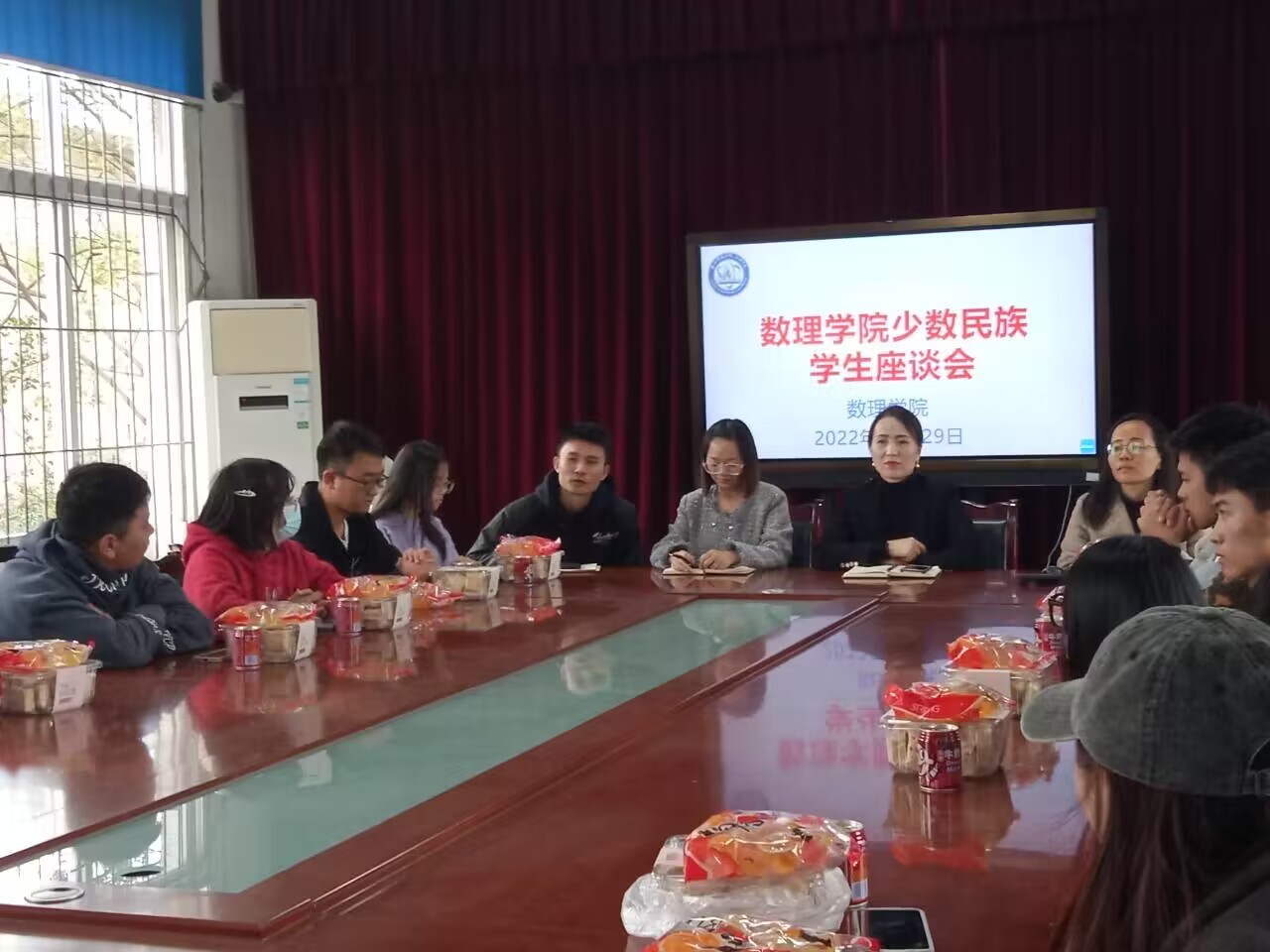 本网讯(文/王章琴 图/廖宇)农历十一月,恰逢彝族新年到来之际,为营造浓厚的节日氛围,进一步增进少数民族同学之间的沟通和交流,促进少数民族学生大团结,激励少数民族学生奋发向上,努力拼搏,11月29日中午,数理学院在学院会议室开展少数民族学生座谈会。学院党委副书记左莉,全体辅导员以及彝族、回族、藏族、土家族等50余名少数民族学生参加了会议。