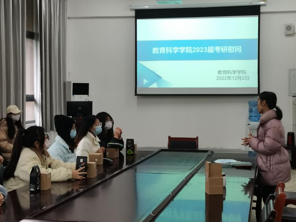 慰问开始,何晓军就学院赠送的杯子以及其背后的故事展开与考研同学的交流,他表示,同学们要努力学习,抓住考研的机会去见一见更大的世界,开拓自己的眼界。针对考研备考,罗立顺基于人生奋斗和大学生的就业现状进行备考指导,他分别从坚持、调整、准备、应考、等待、感恩六个方面对同学们提出建议。他强调,一直以来,教科学院都在竭尽全力为考研的同学开放考研复习提供,希望同学们利用好这一资源,合理安排时间备考,同时考研成绩出来后学院的老师们还会从复试指导、调剂建议等多方面为继续为大家提供帮助。最后,杨婷婷对同学们表达了由衷的祝福,她表示,同学们要在等待中怀着感恩的心,坚信付出终会有回报,不论何种结果“上岸既山林”。她建议大家调整好心态备考,并且预祝同学们考研成功。