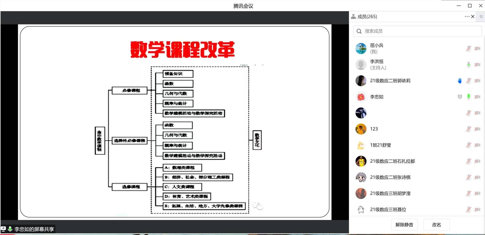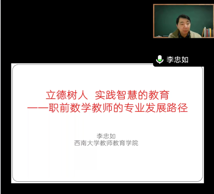 李忠如教授首先深入地介绍了当前基础教育改革的新理念、新要求和新举措,深入浅出地分析了职前中学数学教师面临的新任务,并给出成为合格中学数学教师的大学学习建议。其次他从专业的角度阐述了立德树人,教育任重道远的内涵,特别强调了要全面推进课程思政建设和增强大学生特别是师范生的志气、骨气和底气,加强数学课程改革,不断培养义务教育数学课程的核心素养(“三会”)。最后李教授解析了专业与职业的区别,并鼓励同学们要以从事中学数学教师专业为目标,进而加强中学教师队伍的建设。讲座结束后,李忠如教授与同学们进行了互动交流。