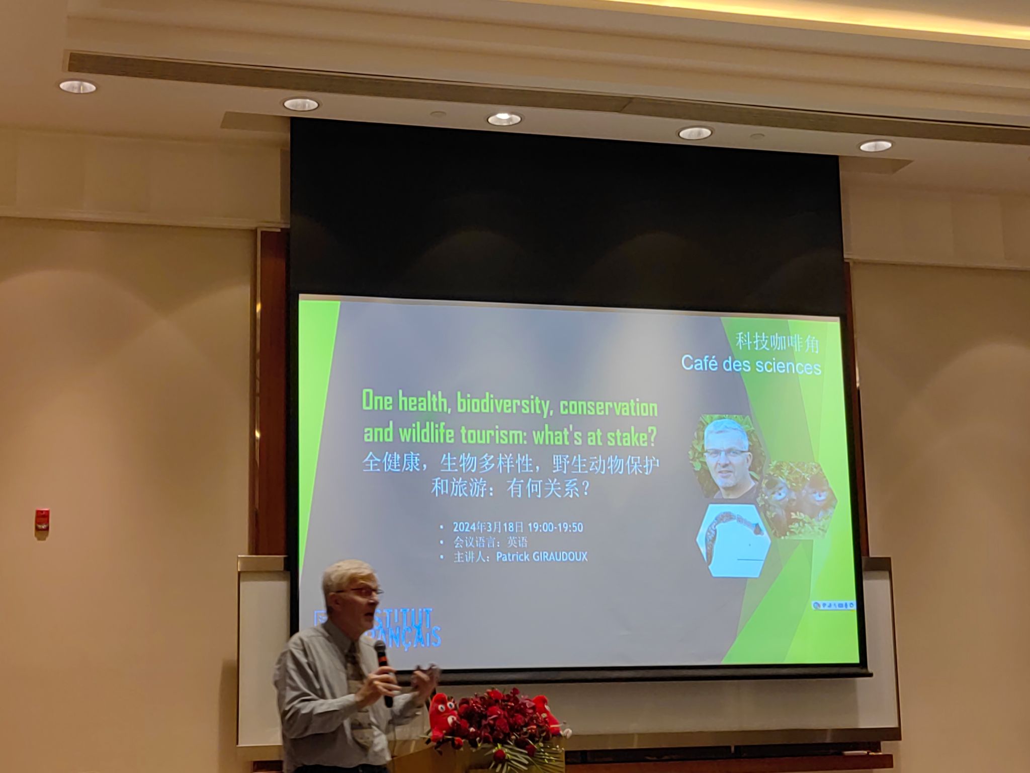 会议由法国驻华使馆科技官员Samuel LIEGEOIS(李森明)主持。会议期间,Patrick Giraudoux教授以“One health, biodiversity, conservation and wildlife tourism: what's at stake?(全健康,生物多样性,野生动物保护和旅游:有何关系?)”为题作了特邀报告。Patrick Giraudoux教授指出生物多样性是可持续发展的关键参数之一,但当前的生物多样性下降,正在破坏地球上人类和许多其他生物的栖息环境,对健康造成了负面影响。因此,这次会议提出了“同一个健康”的概念,在未来生物多样性的重要性将作为研究人员所关注的重要工作之一。这也为我校生物多样性领域科研人员未来的研究方向具有深远的指导意义。