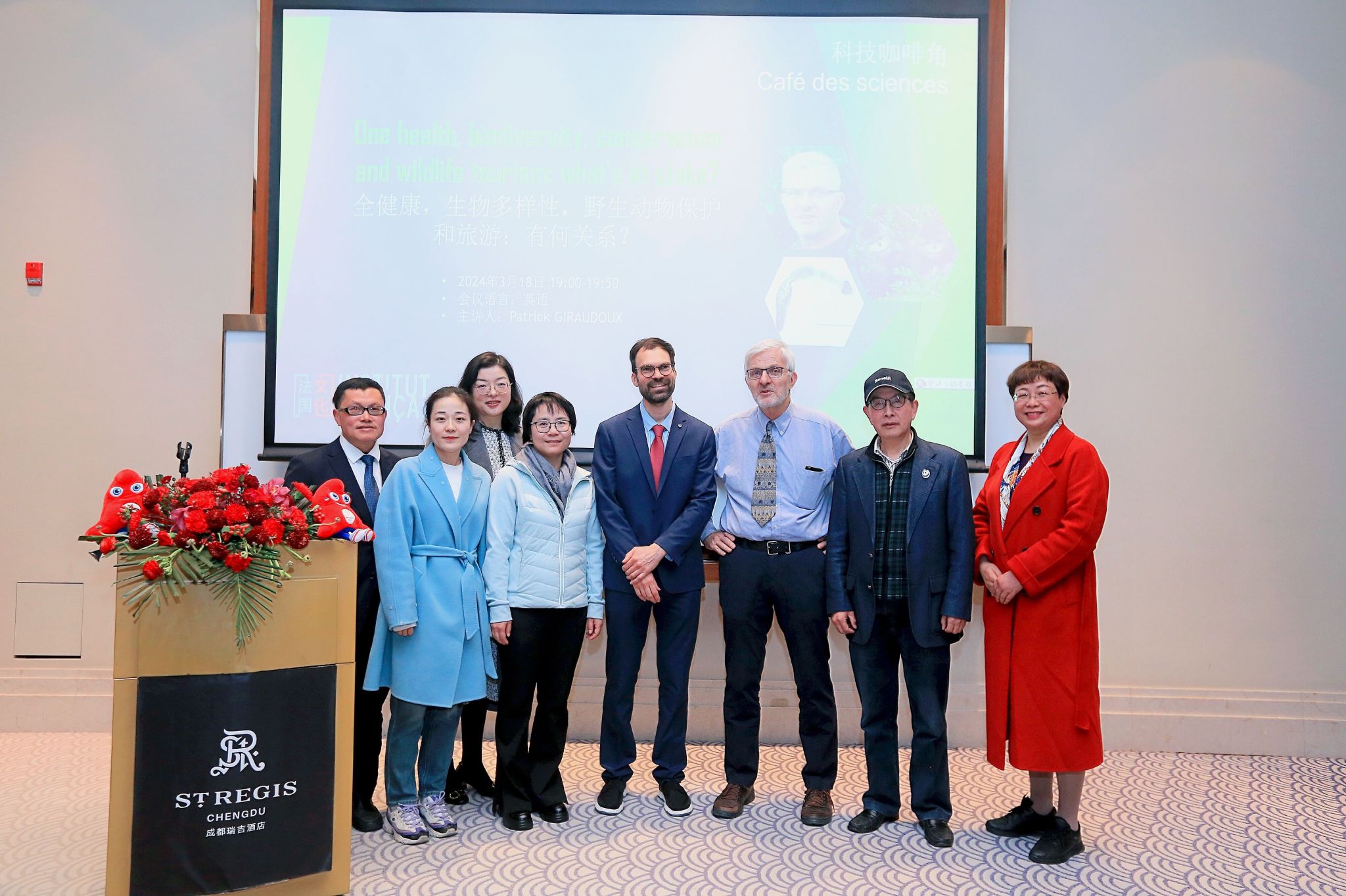 本网讯(文、图/王璐)2024年3月18日,我校生命科学学院唐梅院长、杨益书记、李丽教授、王璐博士,法国弗朗什孔泰大学乐山师范学院特聘教授Patrick Giraudoux,以及旅游与地理科学学院刘洪江教授等一行人参加了由成都领事馆举办的科技咖啡角学术会议,并与四川CDC,四川双宝文化研究中心,大熊猫繁育基地等单位研究人员进行了交流。