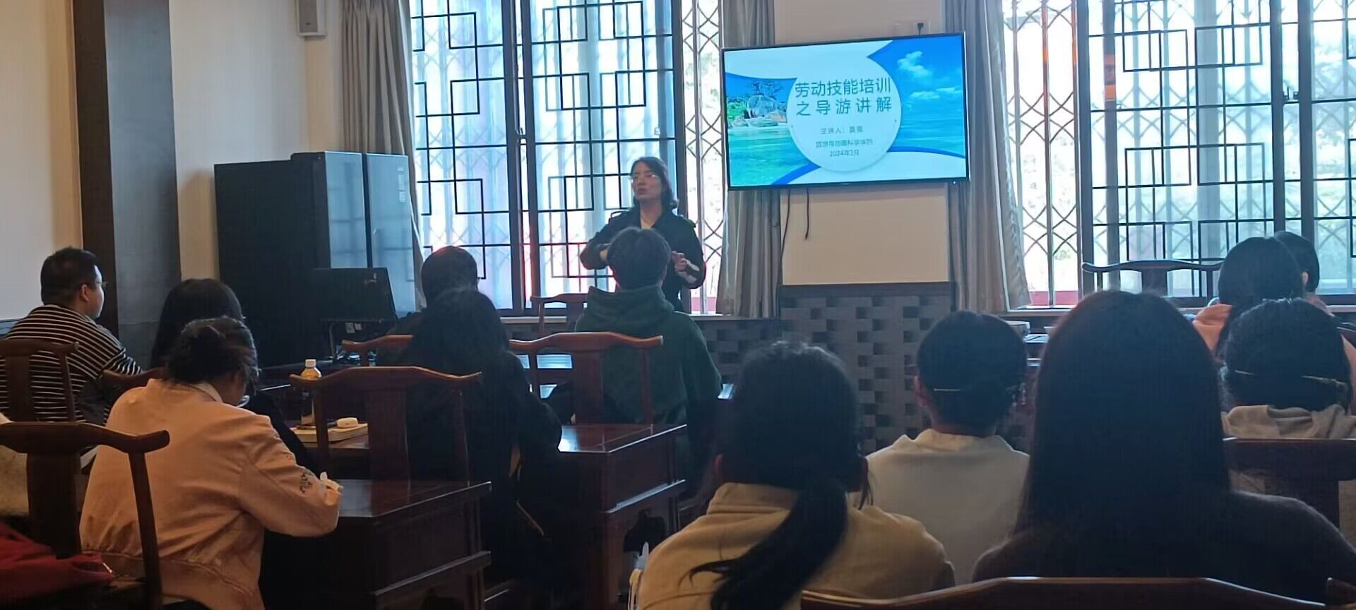 本网讯(文/刘涛、图/余丰羽)为提高同学们的导游讲解技巧,3月20日下午,旅游与地理科学学院于旅院楼茶艺室开展主题为“导游讲解”的劳动技能培训讲座,旅游与地理科学学院分团委书记江纳特邀学院专任教师吴薇老师为即将参加“导游词讲解大赛”的同学们进行导游讲解技能的指导。