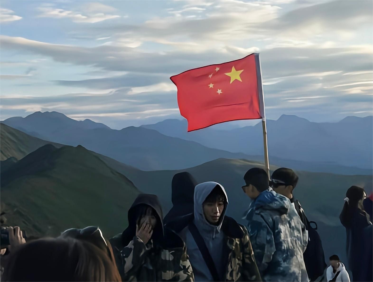 在这一行,我们也发现,有许多年轻人带着国旗来到夹金山。当远方云海翻腾,天边金光乍现时,有一个陌生的青年奋力挥舞着五星红旗,带着笑颜用最洪亮的声音朝着太阳升起的地方呐喊出那句:“中华人民共和国,万岁!”我们的眼泪再也止不住了。感谢我们的先辈用钢铁的意志与不屈的脊梁,为我们撑起如今美好生活的天空。中华人民共和国,万岁!