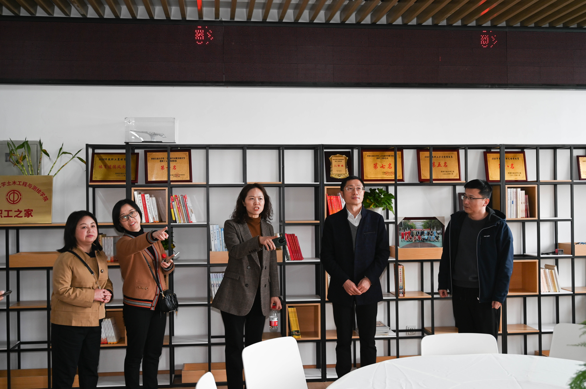 殷冲带领大家先后实地参观了外国语学院、网络与信息化中心、图书馆、土木工程与测绘学院、化学化工学院等5个职工小家。并从建设标准、申报程序、资金保障、固定资产登记、激励支持政策等方面介绍了西南石油大学职工之家阵地建设计划的具体做法和工作经验。双方还对物资采购、工会经费使用报销等情况做了交流。