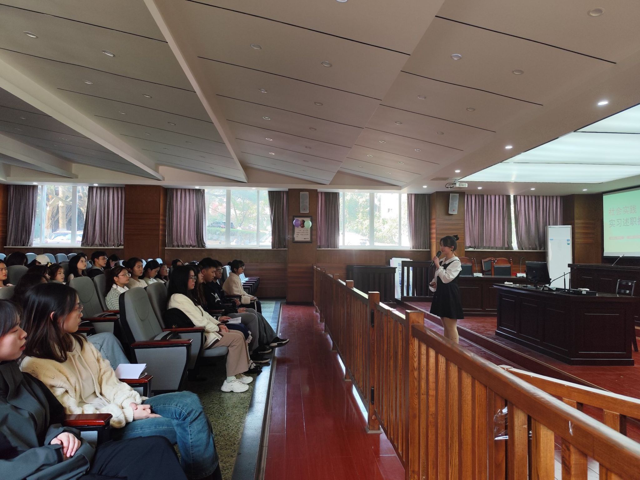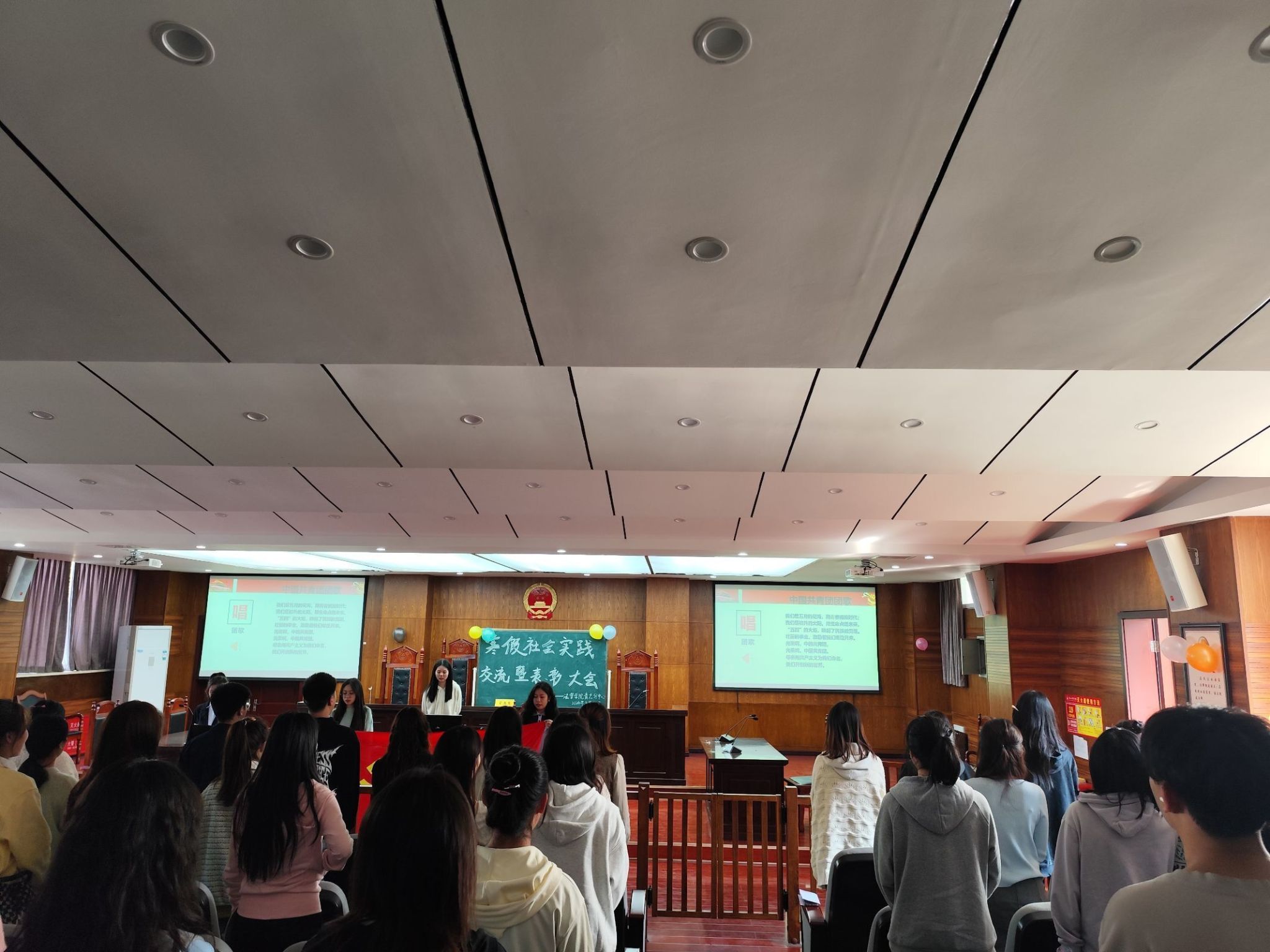大会在青春洋溢的团歌中拉开了序幕。4位获奖学生代表依次上台,采用ppt讲演结合的方式,细致地分享了自己的寒假实践经历,并对实践作出反思与总结。学生代表们纷纷表示适当的社会实践能够提升自我、锻炼能力。台下的同学们认真聆听,深受启发,现场氛围融洽。随后,主持人公布获得表彰的同学名单,现场响起热烈掌声。江琳对此次活动进行总结,同时也对获奖学生们进行了表扬和肯定,鼓励同学们在社会实践与志愿服务之路上不断前行,一路生花。