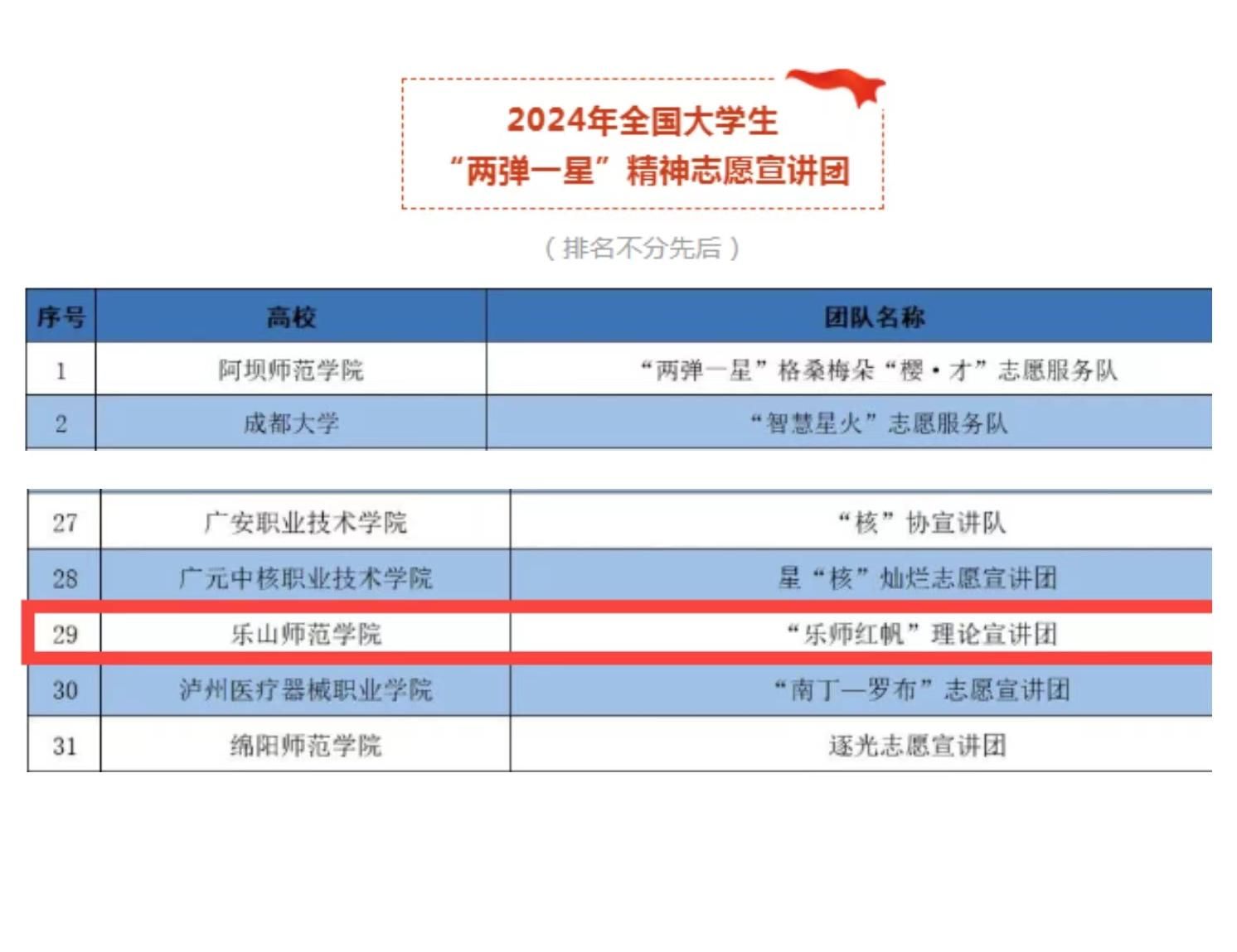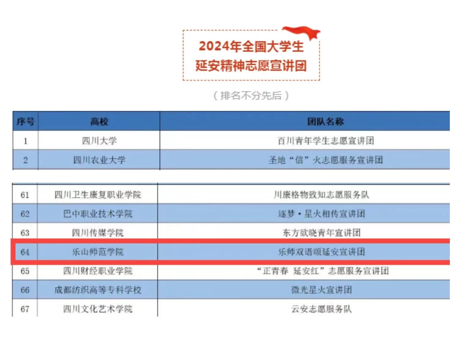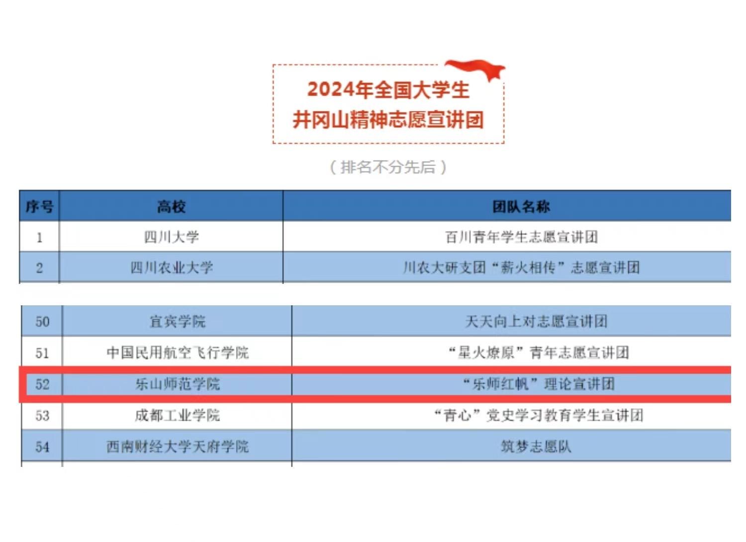 据悉,四川省共入选217支队伍,其中59所高校67支队伍入选延安精神志愿宣讲团,61所高校68支队伍入选井冈山精神志愿宣讲团,64所高校82支队伍入选“两弹一星”精神志愿宣讲团。值得一提的是,“乐师红帆”理论宣讲团在2022年曾荣获四川省暑期社会实践品牌项目,宣讲团成员黄淇玮受邀成为乐山市委宣讲团成员。
