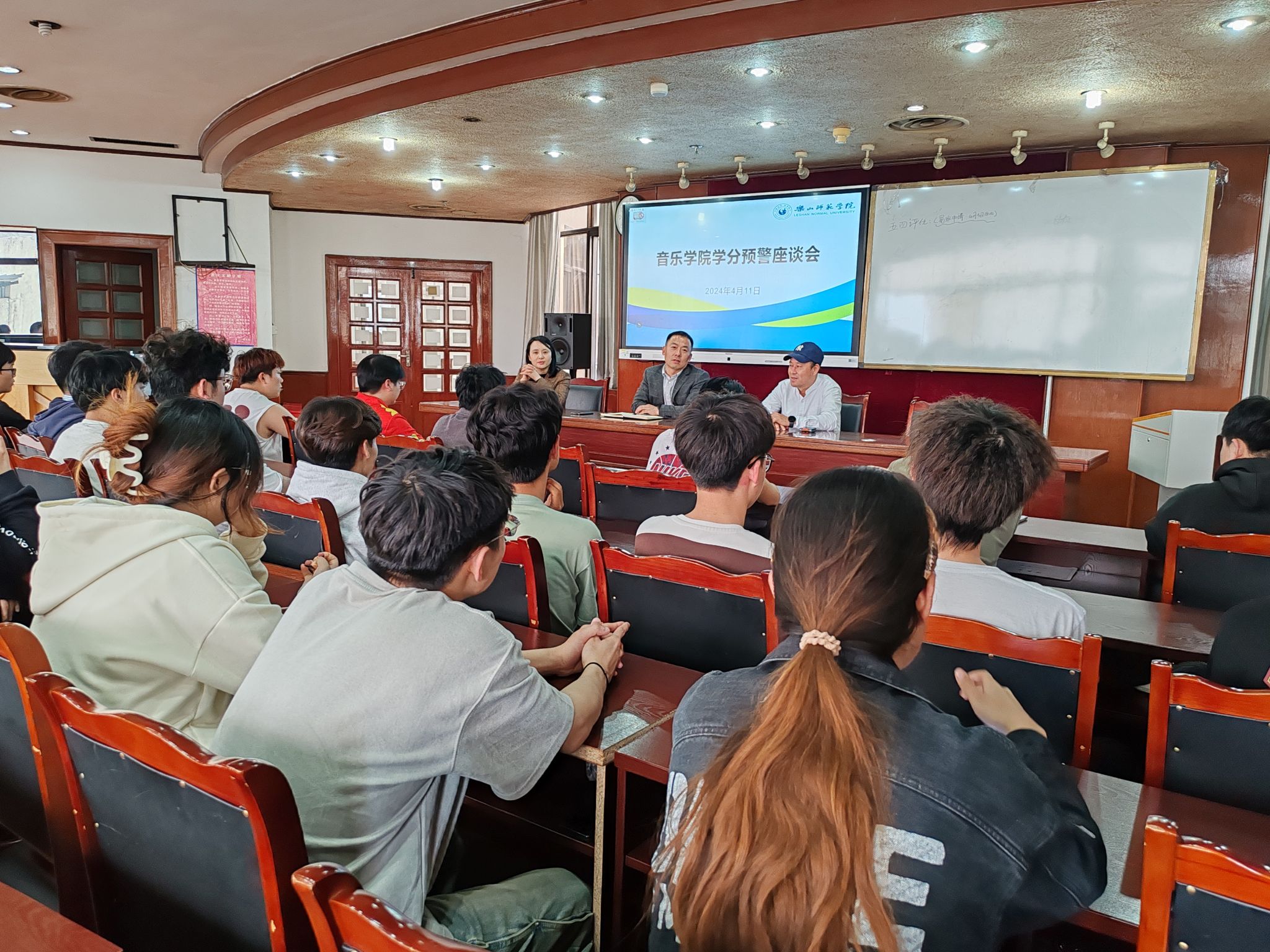 本网讯(文图/张玉莲)4月11日,音乐学院在会议室召开学分预警学生座谈会。音乐学院党委书记宋军,院长周特古斯,党委副书记、纪委书记余友情,全体辅导员以及各年级学分预警学生参加了此次座谈会,会议由余友情主持。