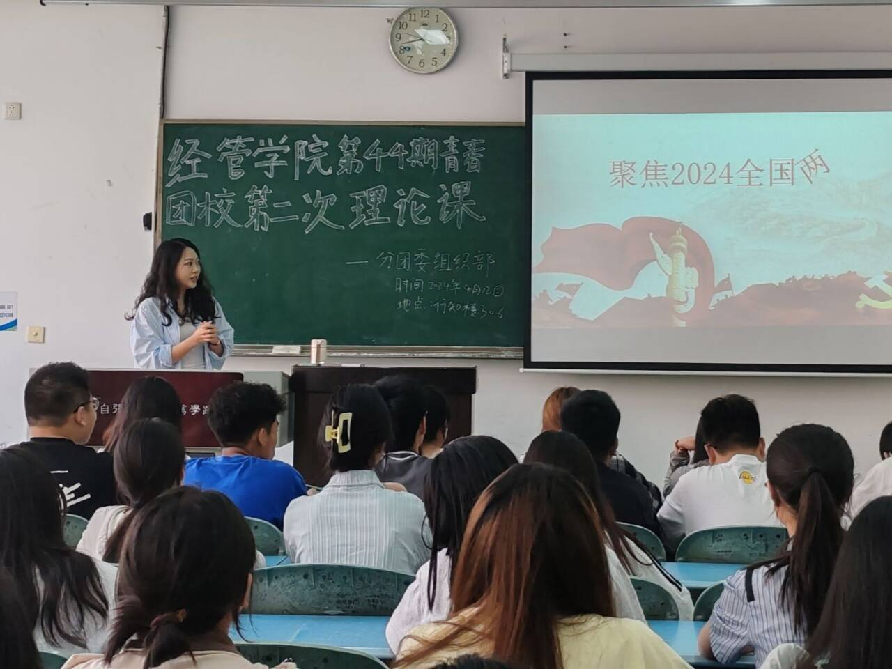 本网讯(文/李济君 图/邵雨凡)为进一步加强学员对两会精神的学习,增强对国家大政方针的理解,同时培养国家意识和民族自豪感,经济管理学院分团委组织部于4月12日在行知楼306教室开展了主题为“青春力量闪耀两会,团校学员共话时代”的青春团校第二次理论课。本次课程特别邀请了马克思主义学院的吴雨老师,为第44期青春团校的全体学员进行授课。