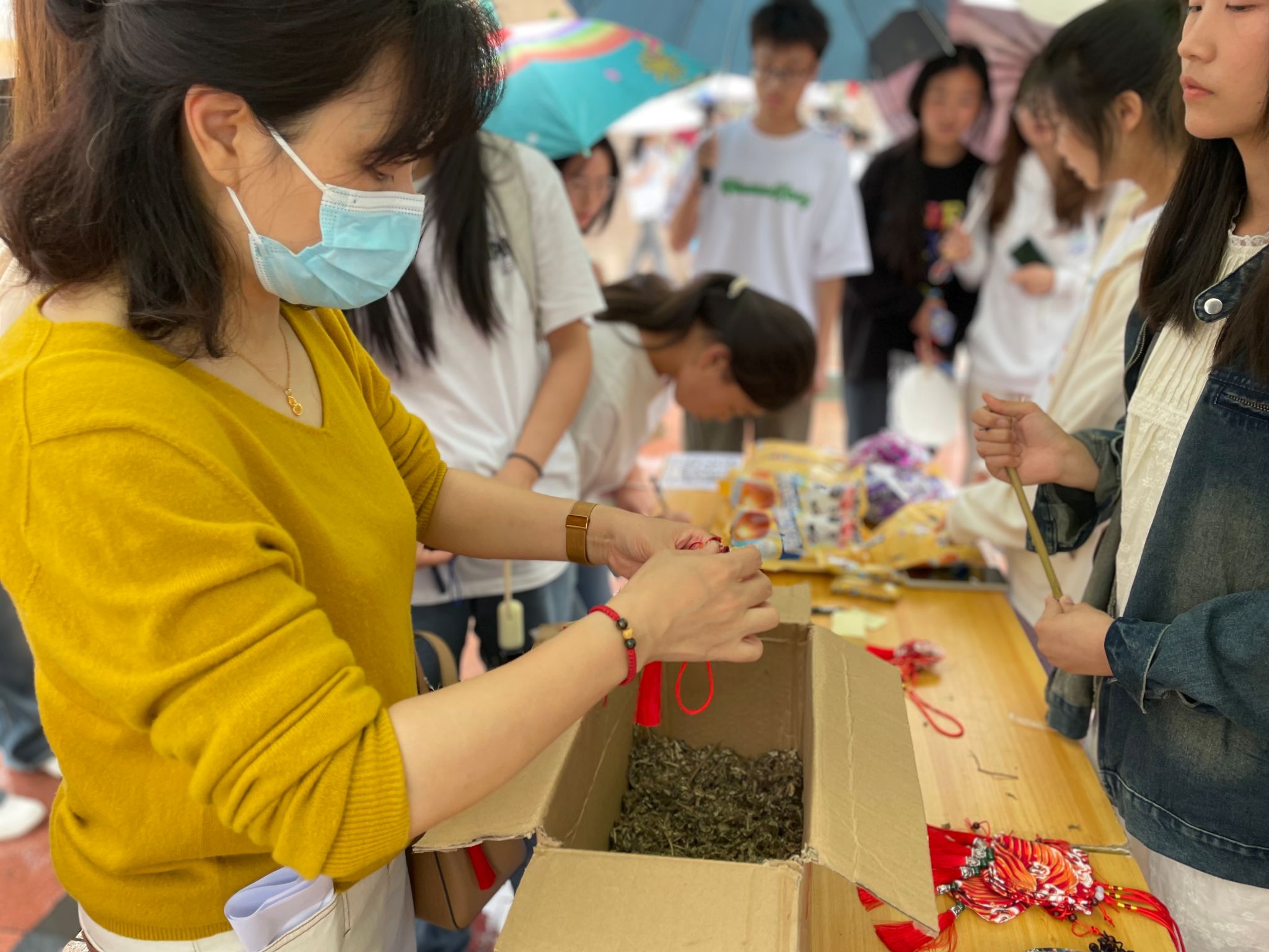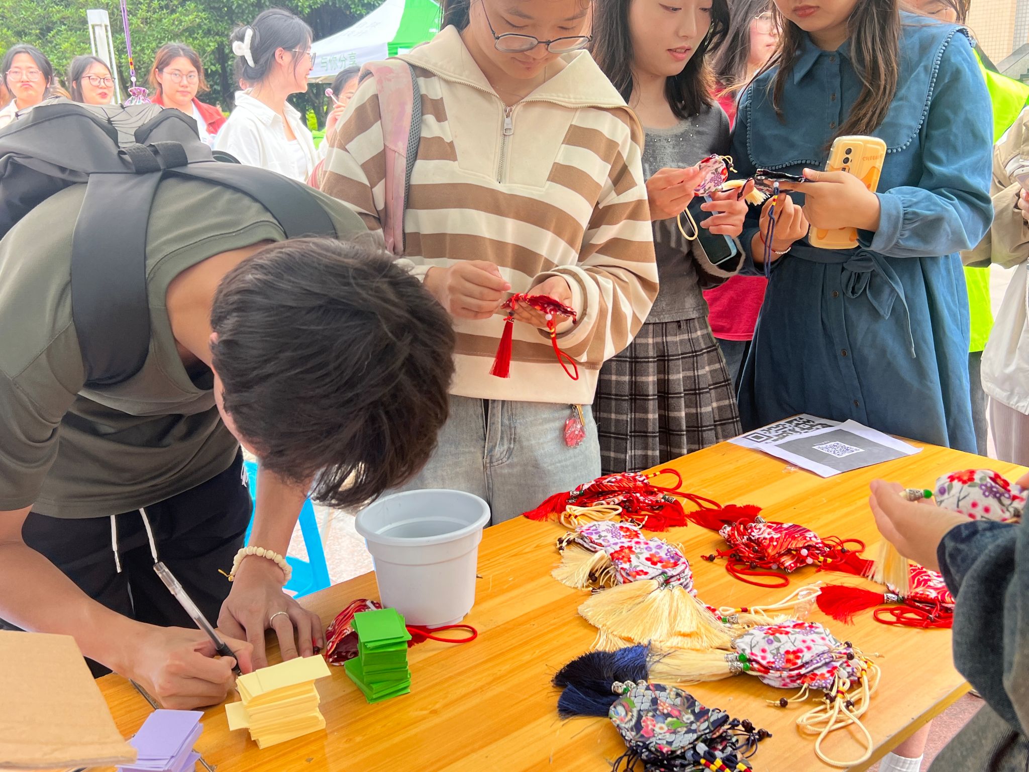 活动吸引了500余名师生热情参与。辅导站负责讲解的志愿者向大家介绍了“芒种”的内涵和艾草香囊的传统知识以及其中蕴含的心理意义,并向大家科普心理健康知识。接着,师生们有序排队挑选了自己心仪的香囊,在彩色纸条上写下自我鼓励的话语,将字条和艾草一起装进香囊里,亲手制作出属于自己的心灵香氛小礼物。活动现场充满了欢声笑语,参加活动的师生不仅收获了香囊,还收获了一份开心和幸福。