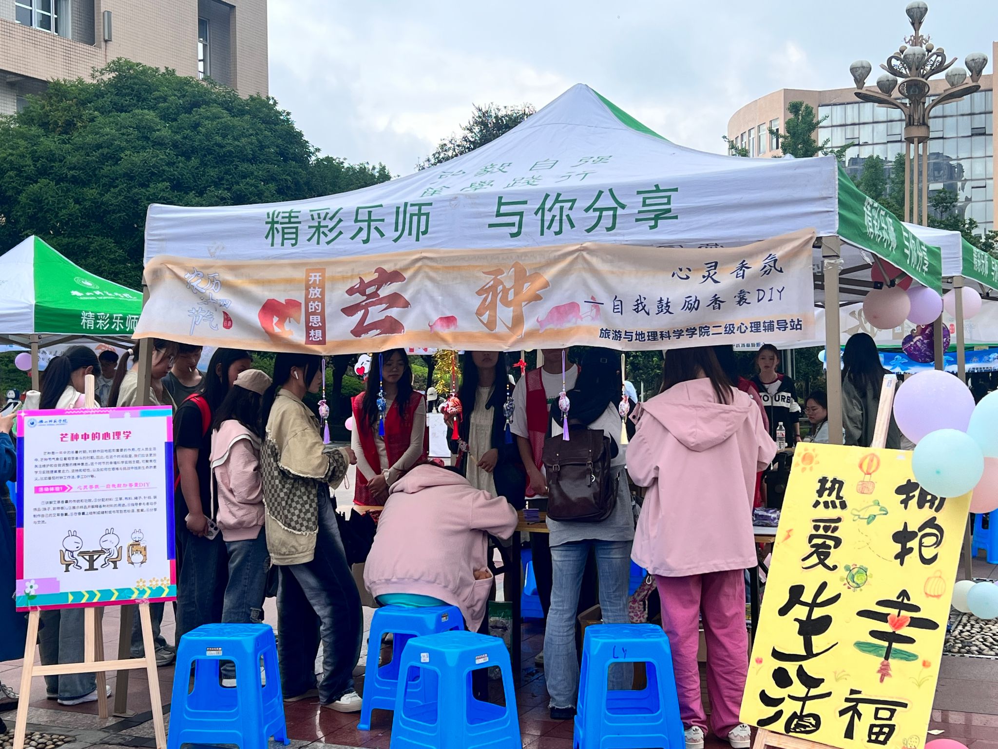 本网讯(文图/李诗雨)4月18日,在学校心理健康教育中心的指导下,旅游与地理科学学院二级心理辅导站(以下简称“辅导站”)在桂花广场开展以“与四时同序,与幸福同行”为主题的心理嘉年华活动,本次活动以“芒种”节气为切入点,举办了“心灵香氛—DIY自我鼓励香囊”心理健康特色活动。