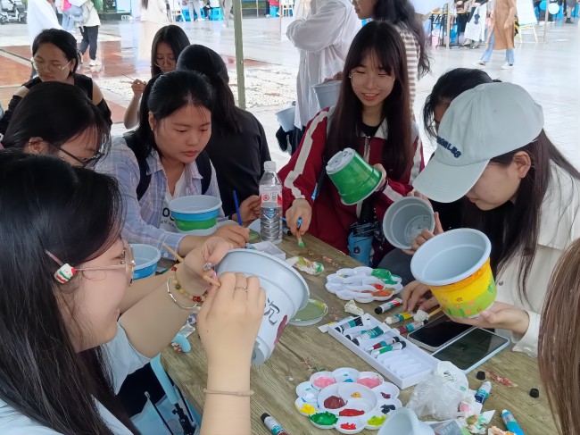 下午两点半,活动正式开始。在工作人员的宣传号召下,很快有大量的同学在现场排起了长队。在宣读了活动内容后,同学们通过猜植物谜语、转发推文等小游戏陆续获得了花种和花盆。随后,同学们在花盆上进行了以“幸福”为主题的DIY设计,赋予了花卉独特的个性与意义。整个活动现场充满了活力与青春的氛围。