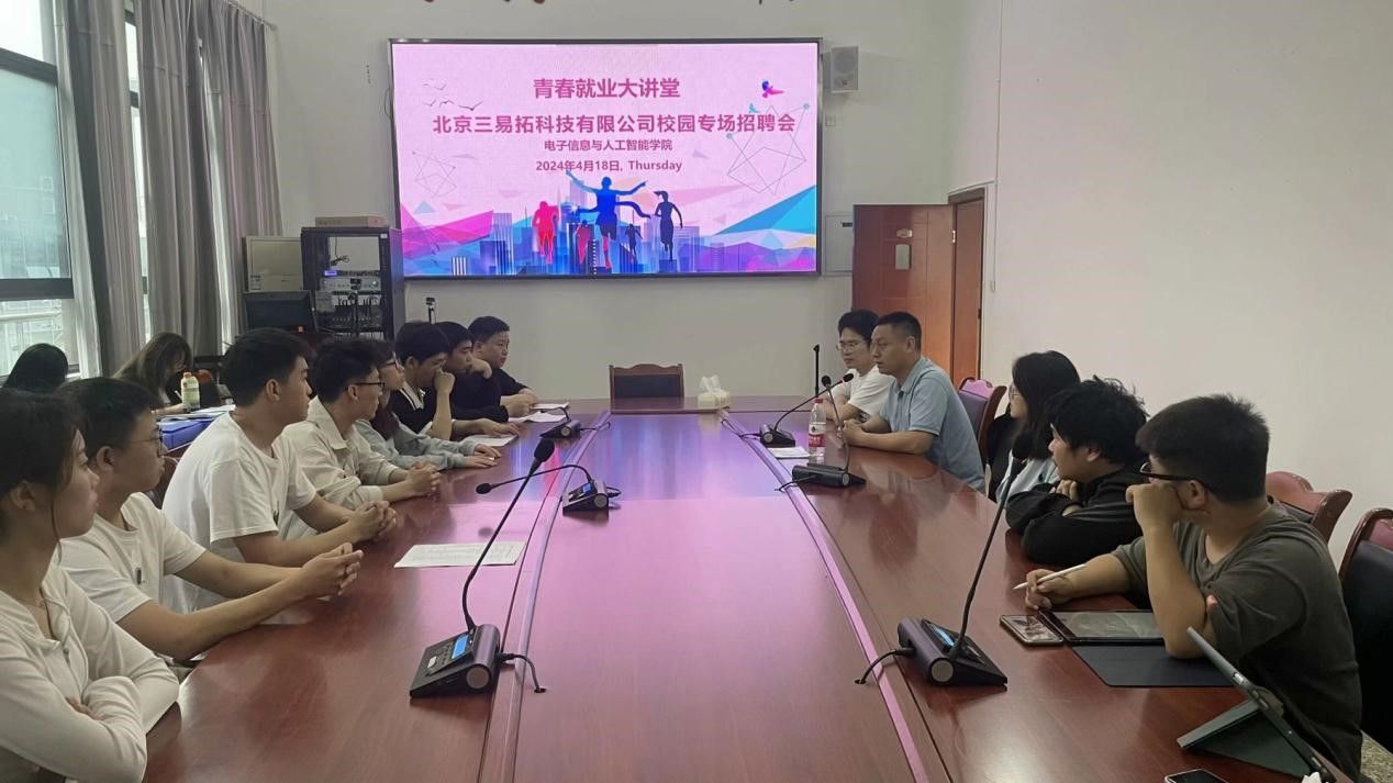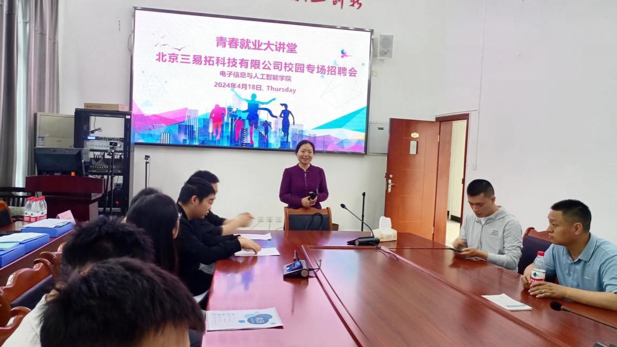 本网讯(文图/付翰林)4月18日,电子信息与人工智能学院在特教C501召开青春就业大讲堂暨北京三易拓科技有限公司校园专场招聘会。本次招聘会邀请到北京三易拓科技有限公司技术负责人兼招聘专员李天华作为主讲嘉宾,电子信息与人工智能学院分团委书记强光平,辅导员谭红梅、雷雄锴和20级计科专业学生共同参与。