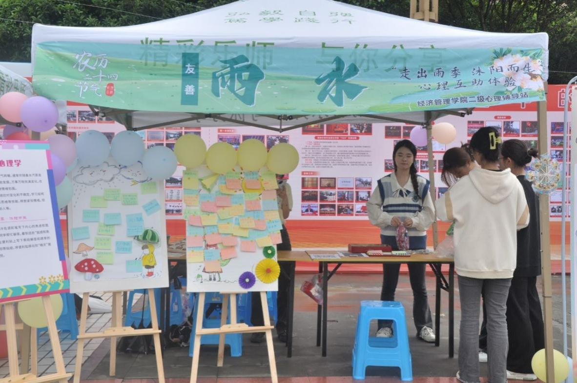 本次心理健康嘉年华以知识展览与现场活动为载体,旨在普及传统文化,为同学们提供心理沟通的平台。经济管理学院二级心理辅导站清以节气雨水为灵感,策划了“走出雨季·沐阳而生”主题活动。同学们通过“雨天”展板倾诉困惑,“晴天”展板传递温暖,辅以娱乐游戏与小礼品增加趣味性,在轻松愉快的氛围中面对和处理内心的困扰。