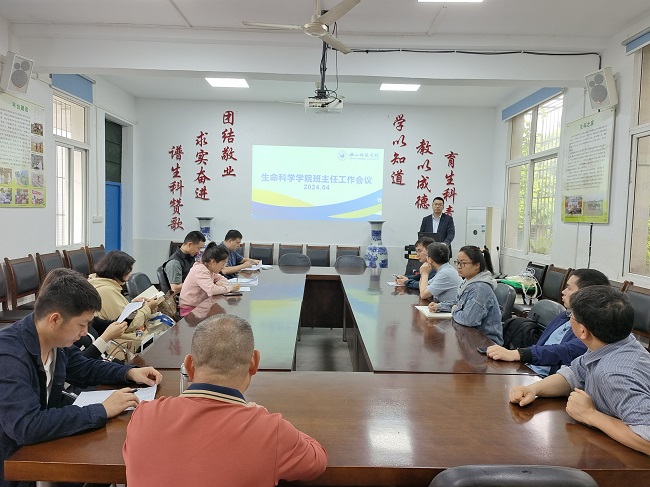 本网讯(文/叶丹 图/黄大智)为全面贯彻党的教育方针,落实“立德树人”根本任务。4月18日,生命科学学院在学院会议室召开班主任工作会议,学院党委副书记包天骏,辅导员曹力欢、胡柏钒以及全体班主任参与此次会议,会议由包天骏主持。