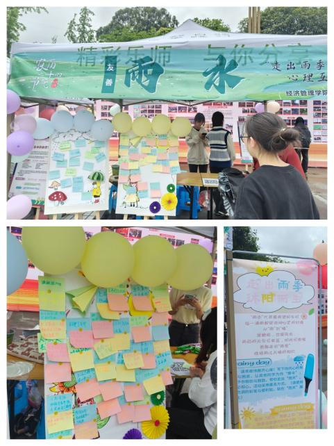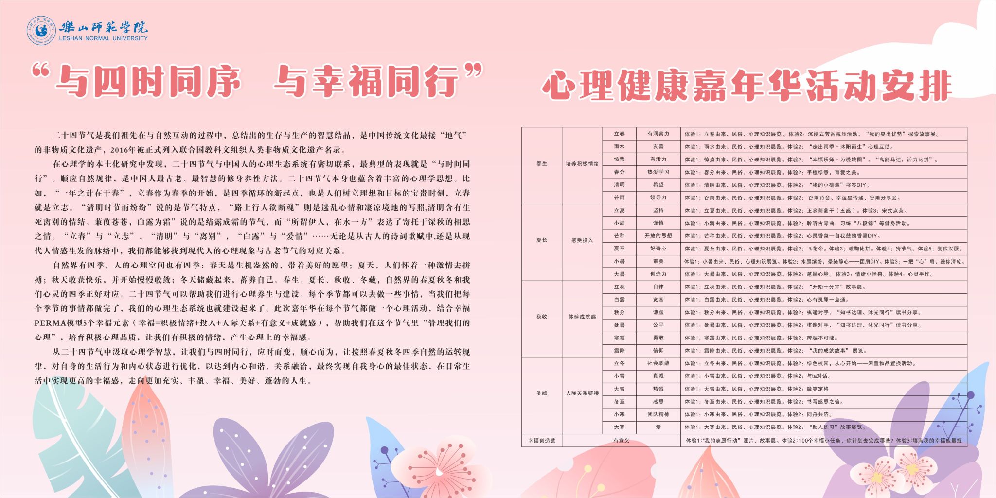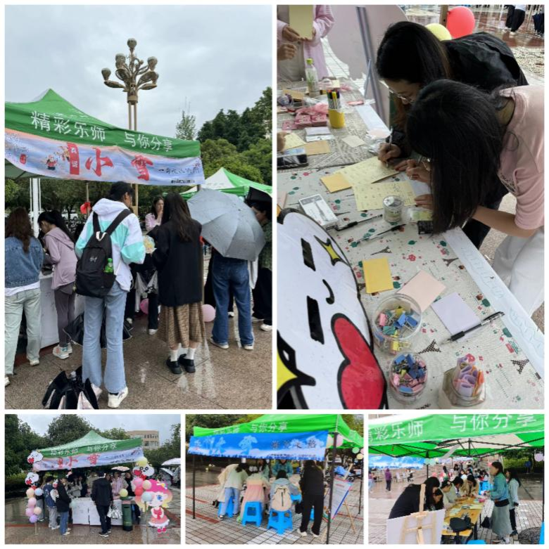 本网讯(文/王雨晴 图/各学院二级心理辅导站)4月18日,我校3·25善爱我—5·25我爱我心理健康教育宣传活动月之心理健康嘉年华在桂花广场顺利举行。乐山市教育局德育科科长谭如意、廖大琴名师工作室成员、党委学生工作部部长黄显刚、心理健康教育中心主任陶媛及各二级学院心理辅导站老师一同参与活动。活动以“与四时同序• 与幸福同行”为主题,通过24节气心理知识展、沉浸活动体验的方式进行,吸引了1200余名师生积极参与。问卷调查结果显示,98.56%的同学认为此次嘉年华活动感到满意。