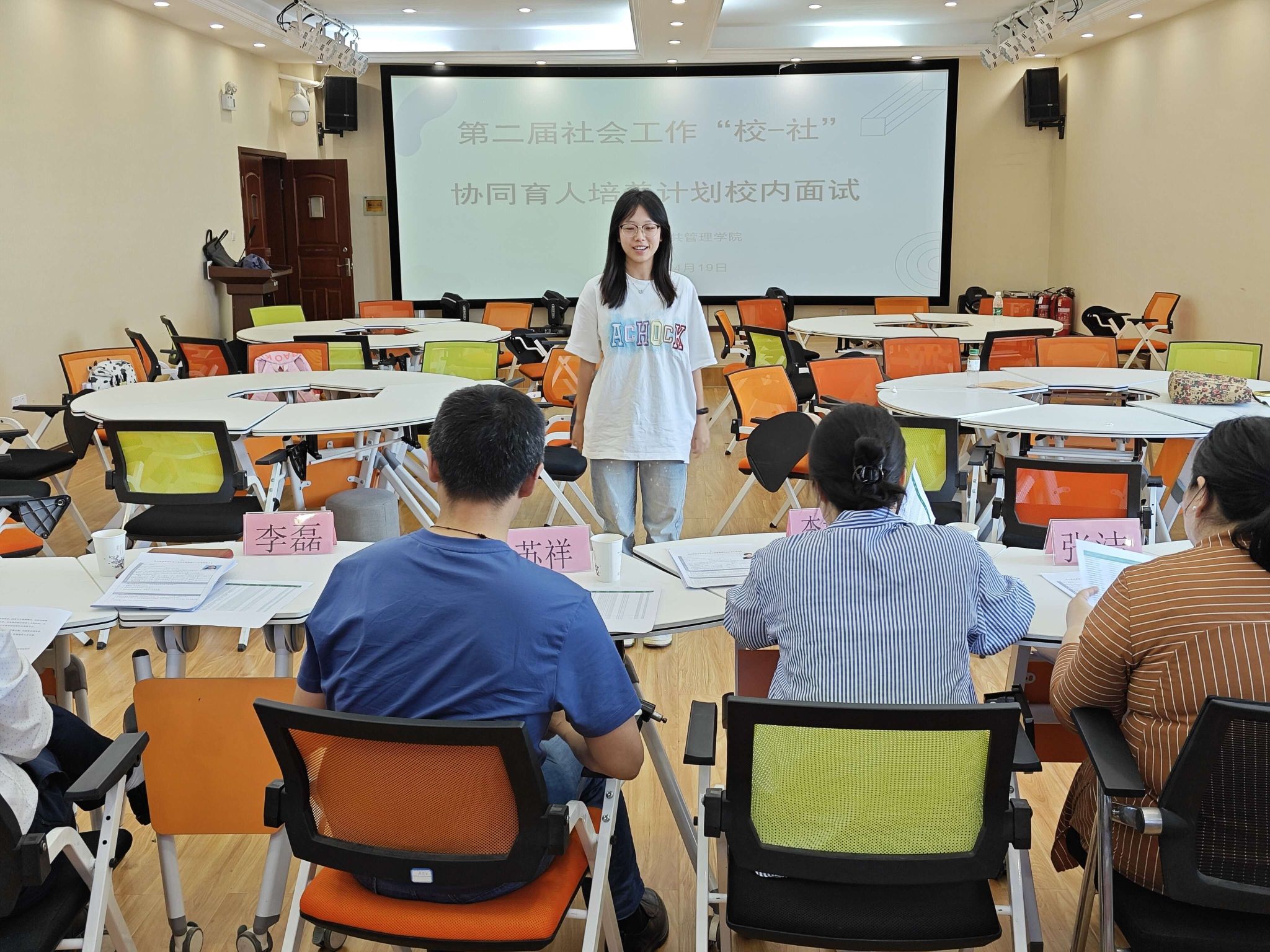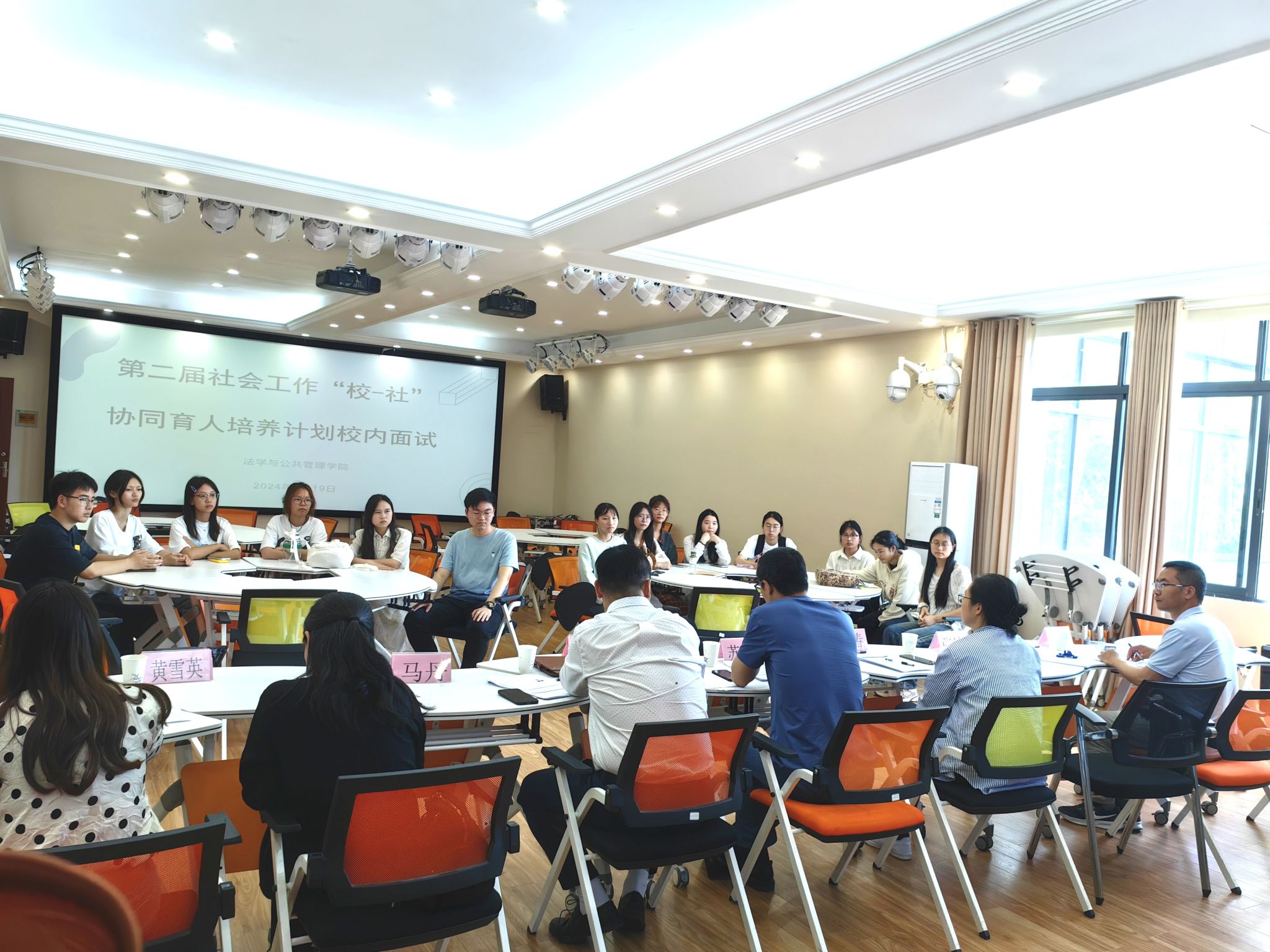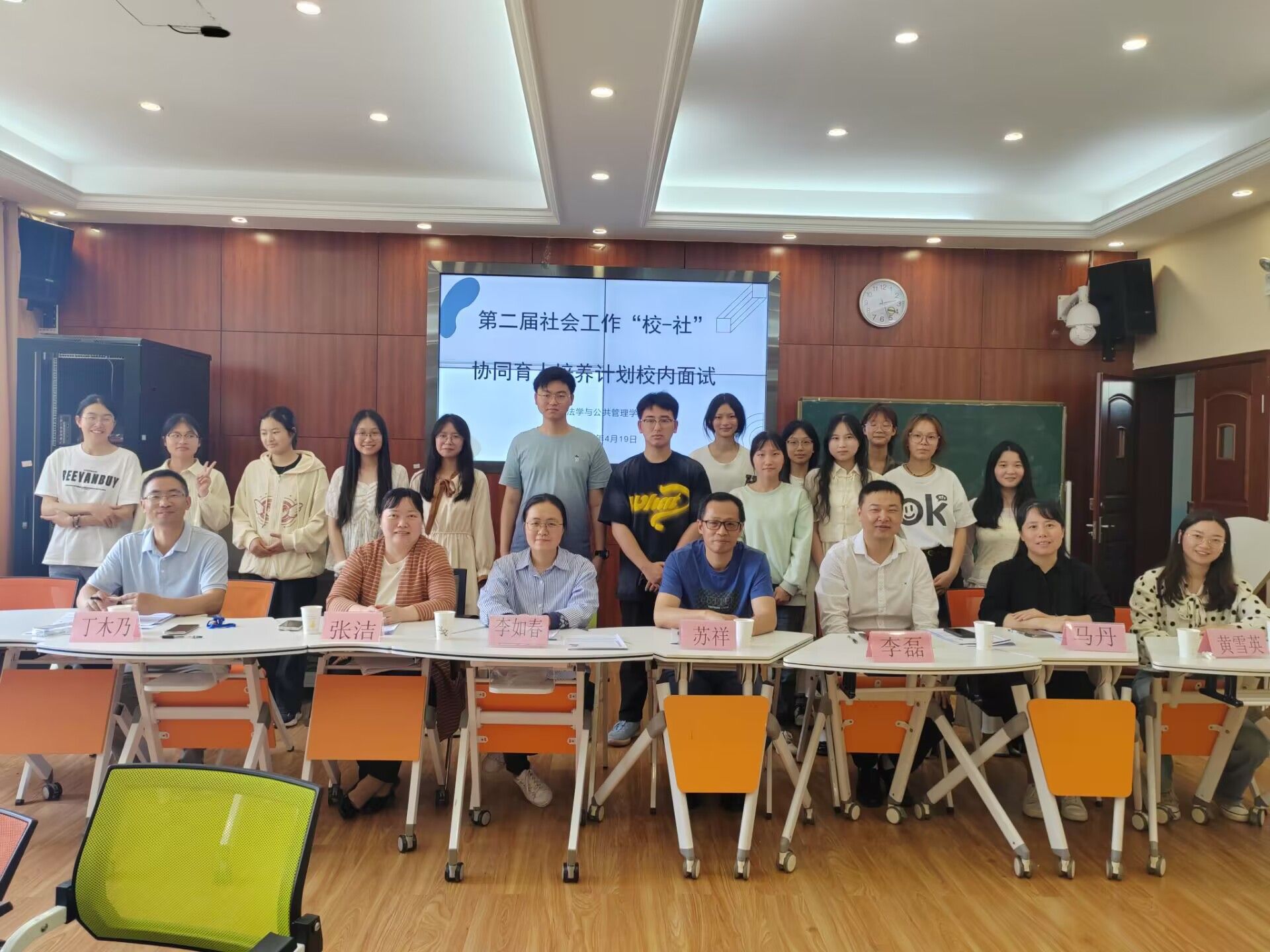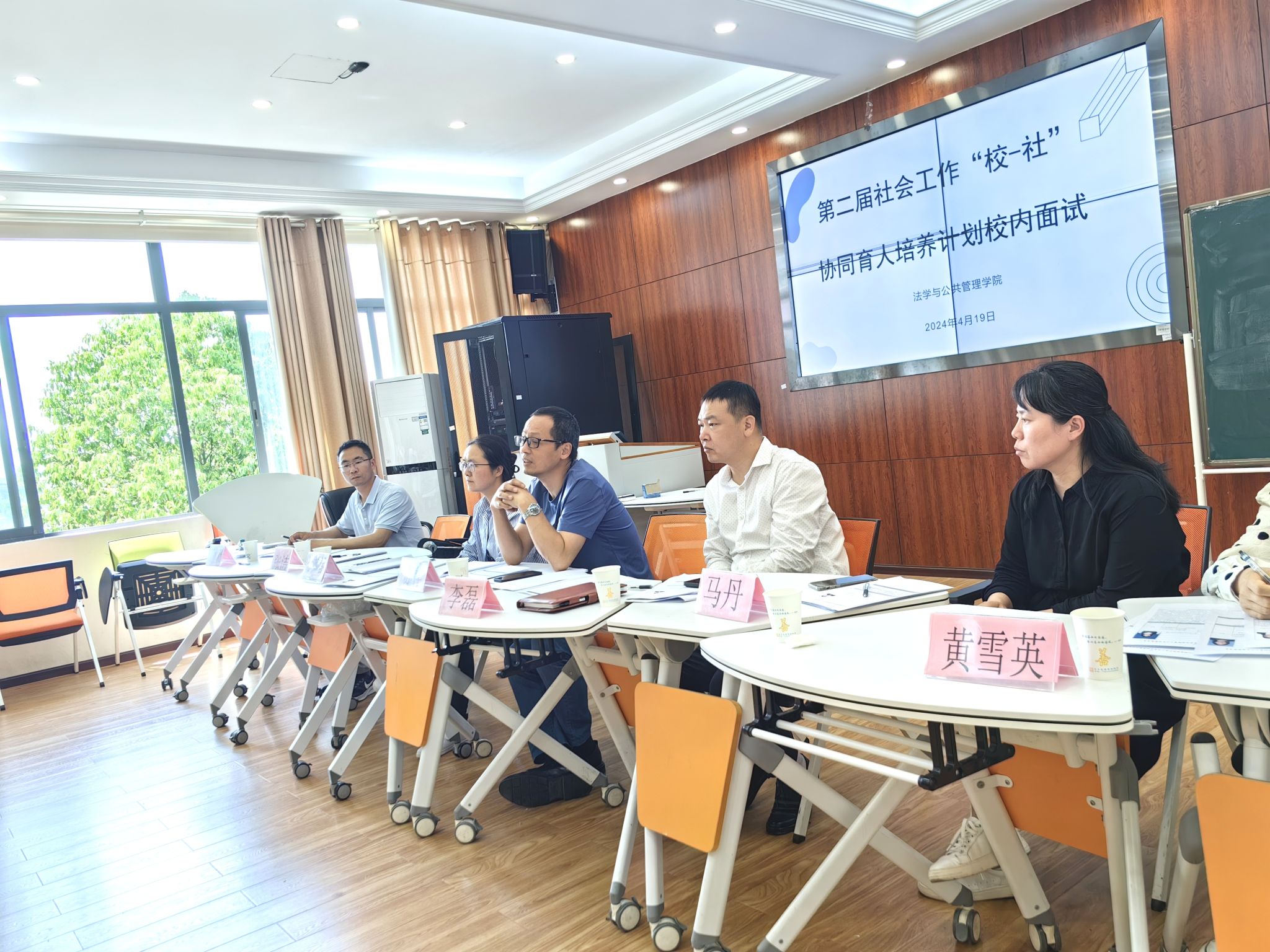 本网讯(文图/李思嘉)为全面评估学生素质、推动教育公平和优质发展,形成更为科学、全面、公正的育人机制,法学与公共管理学院于4月19日下午12:50在实训楼A栋510进行了第二届社会工作“校—社”协同育人培养计划校内面试。本次面试有14名报名学生参与,面试官由院长苏祥、社工系主任李如春、副教授李磊、社会工作专任教师丁木乃,张洁,马丹,黄雪英共计7人组成。