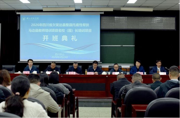 本网讯(文/胡蝶 图/刘艺秋)3月23日上午,四川省欠发达县整县托底性帮扶马边县教师培训项目·名校(园)长培训在弘毅楼413会议室正式起航。马边县教育工委副书记向勇、马边县教师进修校副校长曾传飞、乐山师范学院继续教育学院院长南麒、外国语学院全体领导班子,以及培训班全体学员出席了开班典礼。